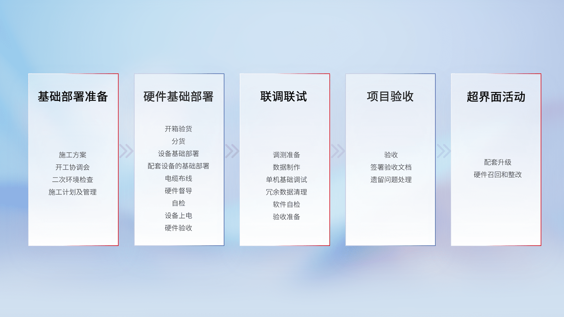 从基础部署准备、、、、硬件基础部署、、、、联调联试、、、项目验收、、越界面活动的全过程可追溯,,,,保证施工质量和进度。。。
